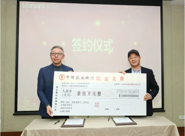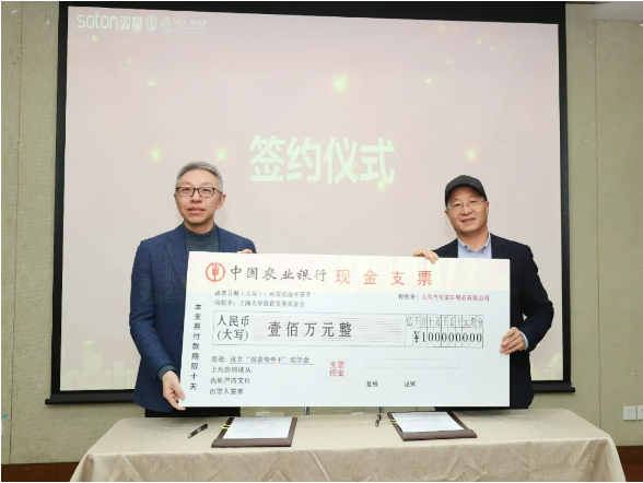 捐贈(zèng)簽約儀式中,雙童創(chuàng)始人樓仲平代表雙童進(jìn)行首期100萬(wàn)的獎(jiǎng)學(xué)金捐贈(zèng),上海大學(xué)對(duì)外聯(lián)絡(luò)處處長(zhǎng)、校友會(huì)辦公室主任陳方泉代表上海大學(xué)接受捐贈(zèng)。值得一提的是,上海大學(xué)成為雙童投身教育基金的第五所大學(xué),是雙童深耕教育、反哺社會(huì)的又一重要實(shí)踐。