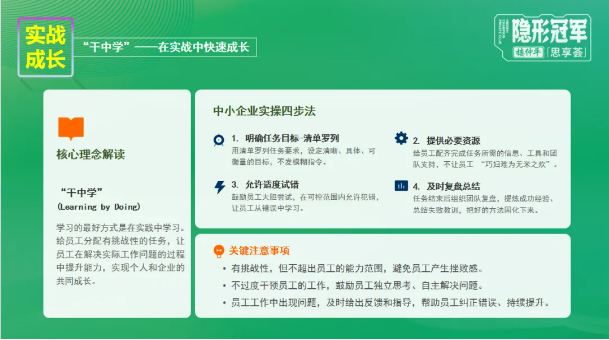雙童的育人體系核心是“低投入、高產出”:通過“干中學”讓員工在解決實際問題中提升能力,分配有挑戰(zhàn)性的任務,允許適度試錯并及時復盤;通過“清單化育人”為后勤、行政、安保等崗位制定詳細工作節(jié)點,讓員工清楚“該做什么、怎么做”;通過“常態(tài)化學習分享”,每日線上打卡、每周主題學習會,讓輸出成為最好的輸入;更有“師徒制”一對一精準帶教,明確師徒職責,將帶教效果與考核、晉升掛鉤,還會給予導師激勵,確保經驗薪火相傳。