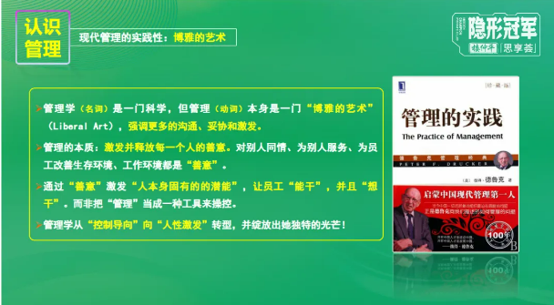 管理學(xué)是一門科學(xué),但管理本身,其實(shí)是一門“博雅的藝術(shù)”,樓仲平老師在課上反復(fù)強(qiáng)調(diào),管理的本質(zhì)是激發(fā)并釋放每一個(gè)人的善意,而非把管理當(dāng)成操控員工的工具。圍繞這一核心,樓仲平老師提出的管理藝術(shù)三大追問,精準(zhǔn)戳中企業(yè)經(jīng)營的核心痛點(diǎn),也為創(chuàng)業(yè)者們指明了方向。