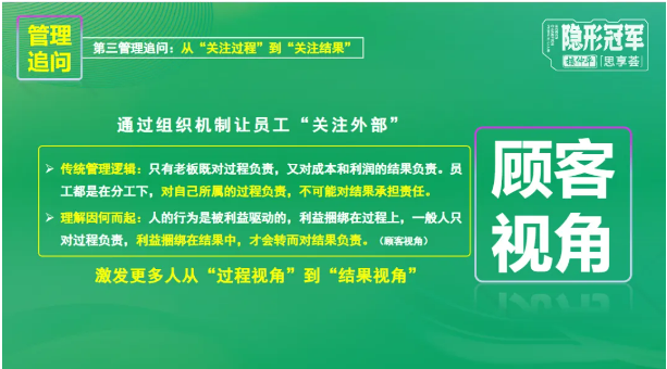關(guān)于結(jié)果,樓仲平老師為大家拆解了背后的核心邏輯:傳統(tǒng)管理里只有老板對(duì)結(jié)果負(fù)責(zé),根源其實(shí)在利益的綁定邏輯,利益綁在過程上,人就只會(huì)對(duì)過程負(fù)責(zé);利益綁在結(jié)果里,人才會(huì)主動(dòng)轉(zhuǎn)向結(jié)果視角。