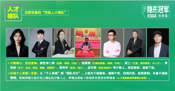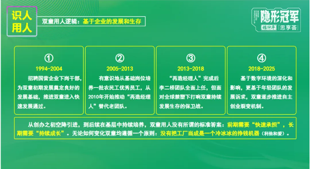 帶人育人的關(guān)鍵,是給予空間、信任與尊重!對(duì)雙童第一代管理者張國俊,相敬如賓、亦師亦友,充分給予尊重與發(fā)展空間;對(duì)李二橋,絕對(duì)信任、因勢(shì)利導(dǎo),在成長(zhǎng)過程中給予保護(hù)與期許;對(duì)90后、00后新生代員工,學(xué)會(huì)妥協(xié)與包容,讓年輕人帶年輕人,消除代際博弈。如今雙童搭建的“四級(jí)人才梯隊(duì)”,抓住核心人才層層復(fù)制、逐級(jí)下放,實(shí)現(xiàn)從“個(gè)人英雄”到“團(tuán)隊(duì)共生”的轉(zhuǎn)變,讓人才在組織中自然涌現(xiàn)!