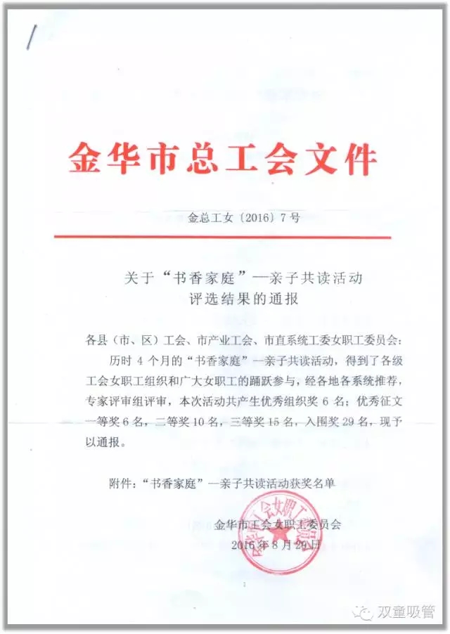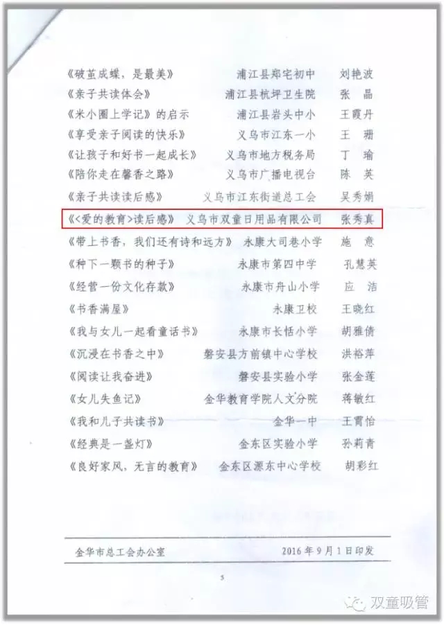 不過,好消息還沒結(jié)束!沒過多久,這篇讀后感又被作為優(yōu)秀作品,參選了金華總工會的比賽評選,并獲得了優(yōu)秀獎呢!吸管妞仔細(xì)看了一下,沒想到“雙童”竟然是所有60家獲獎單位里唯一一家企業(yè)單位呢!要知道,參加這類比賽并且獲獎的基本上可都是各大學(xué)校和事業(yè)單位??!我們的“雙童”寶貝是不是很棒呢!下面妞就把這篇讀后感放上來和大家共享,一起和孩子感受“愛的教育”吧!