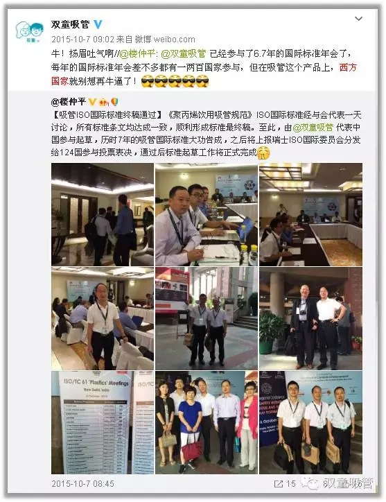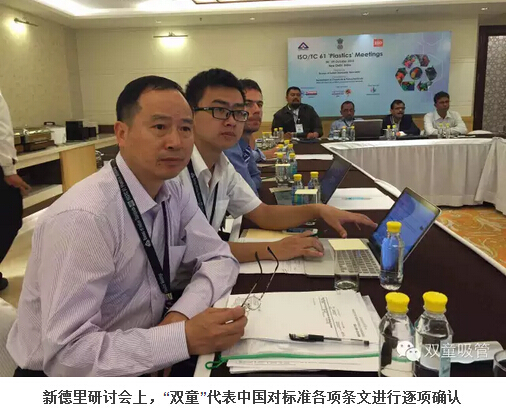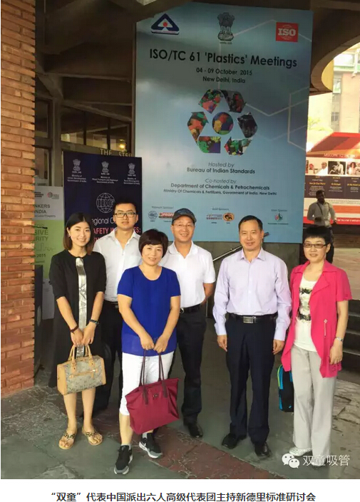 2015年10月6日,ISO TC61國(guó)際標(biāo)準(zhǔn)化組織年會(huì)在印度新德里召開(kāi),作為最后一次國(guó)際標(biāo)準(zhǔn)起草工作的定稿工作,“雙童”代表中國(guó)派出了強(qiáng)大的六人技術(shù)代表團(tuán)。經(jīng)過(guò)幾天緊張的討論,“雙童”會(huì)同各參與主席國(guó)對(duì)《聚丙烯飲用吸管規(guī)范》送審稿的各項(xiàng)條文進(jìn)行最終的程序性確認(rèn),在參與各國(guó)代表一致同意下形成了《聚丙烯飲用吸管規(guī)范》ISO國(guó)際標(biāo)準(zhǔn)報(bào)批稿,提交給瑞士日內(nèi)瓦的ISO國(guó)際標(biāo)準(zhǔn)化組織最終審定。
