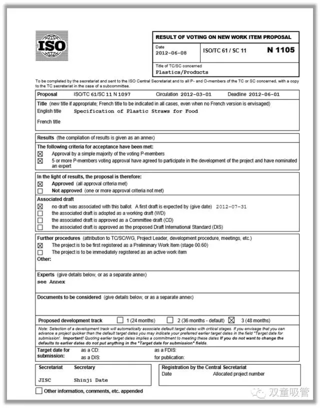 ISO國(guó)際標(biāo)準(zhǔn)化組織下發(fā)的《聚丙烯飲用吸管規(guī)范》標(biāo)準(zhǔn)任務(wù)書