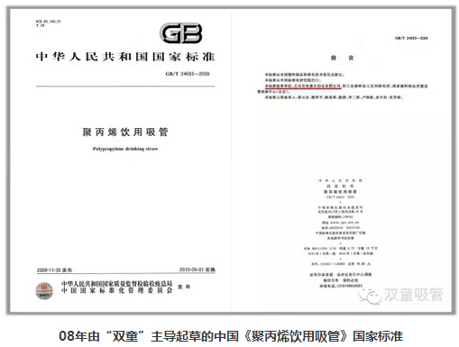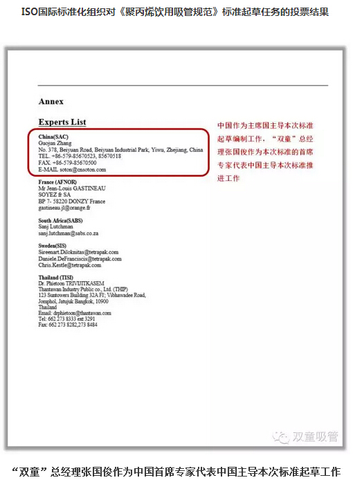 通過(guò)四年時(shí)間的努力,ISO國(guó)際標(biāo)準(zhǔn)化組織于2012年6月8日對(duì)《聚丙烯飲用吸管規(guī)范》ISO國(guó)際標(biāo)準(zhǔn)的起草編制工作進(jìn)行投票表決,并以三分之二的絕對(duì)多數(shù)獲得通過(guò),并批準(zhǔn)以中國(guó)、泰國(guó)、瑞典、法國(guó)、南非5國(guó)組成的《聚丙烯飲用吸管規(guī)范》國(guó)際標(biāo)準(zhǔn)起草委員會(huì),“雙童”作為當(dāng)時(shí)全球最專業(yè)的吸管制造企業(yè)被推舉為本項(xiàng)國(guó)際標(biāo)準(zhǔn)的起草主席國(guó)以推進(jìn)本項(xiàng)標(biāo)準(zhǔn)的起草編制工作。