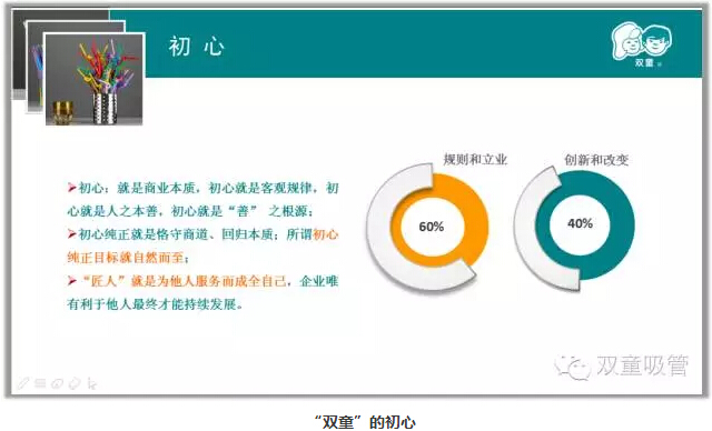 管理就是講道理,讓員工更容易接受和理解。只有初心純正,不斷地投入和付出,才能獲得團隊的目標。“雙童”實行的小客戶原則,放棄大客戶,做自己的品牌也是基于初心,圍繞客觀規(guī)律做出的選擇。公司硬件的投入同樣也是基于“初心”,唯有良好的硬件才能潛移默化地影響員工的意識形態(tài),從而影響員工生產(chǎn)出好的產(chǎn)品。公司的學習會,引導員工不斷學習,建立“家文化”,也是為了讓員工全身心投入,從而更好的工作。這一切都是基于商業(yè)本質(zhì)做出的改變。