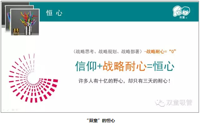 我們強調(diào)戰(zhàn)略思考、戰(zhàn)略規(guī)劃、戰(zhàn)略部署,唯獨缺少戰(zhàn)略耐心。“恒心”是信仰加上戰(zhàn)略耐心。創(chuàng)新就是改變,就是持續(xù)積累。創(chuàng)新需要戰(zhàn)略耐心,需要十年為一個單位的恒心。“雙童”其實很簡單,知道自己應該放棄什么,追求什么。唯一的依據(jù)就是回歸初心,建立信仰,遙望天空,腳踏實地,做好當下。
