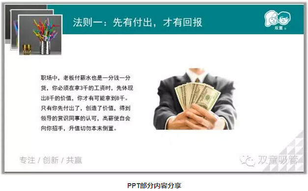 下面就是今天這堂課的干貨,職場升值法則!法則一:先有付出,才有回報!你必須在拿3千的工資時,先體現(xiàn)出8千的價值,你才有可能拿到8千。只有你先付出了,創(chuàng)造了價值,得到領(lǐng)導的賞識同事的認可,高薪便自會向你招手,升值切勿本末倒置。