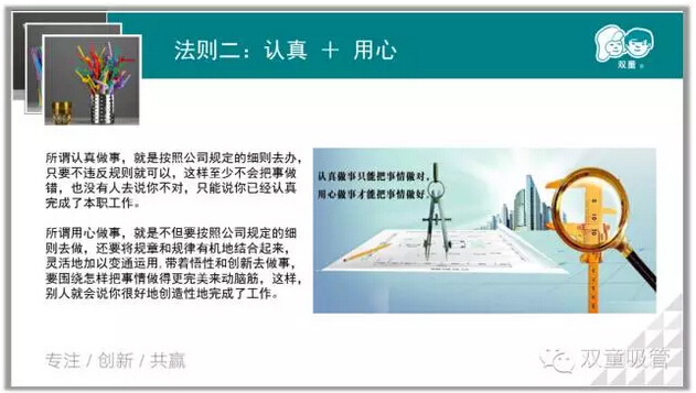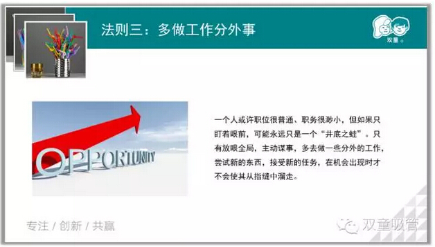 法則二:認真+用心。我們不但要認真工作,還得用心做事。除了完成本職工作之外,還要靈活并加以變通,帶著悟性和創(chuàng)新去做事,力求把工作做得完美。法則三:多做工作分外事。完成自己的本職工作外,主動謀事,多去做一些分外的工作,嘗試新的東西,接受新的任務,在機會出現(xiàn)時才不會使其從指縫中溜走。