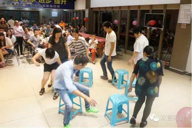 七個人六個凳子?沒錯,接下來就是我們的搶凳子游戲啦!隨著音樂的停止,童鞋們得搶凳子,沒有凳子坐的童鞋可就被淘汰啦!“快,快坐上!”底下的壽星們真是比玩游戲的選手還激動呢!