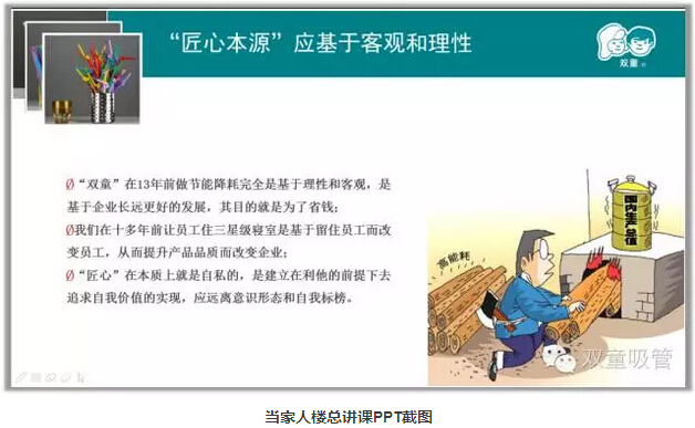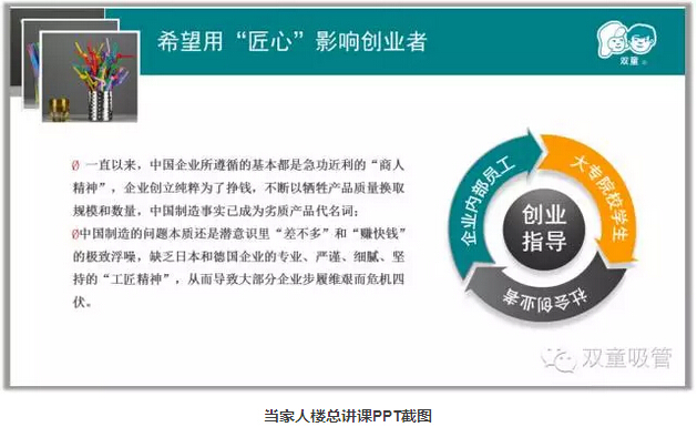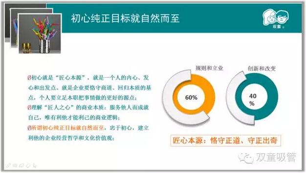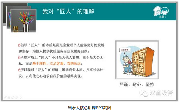 接下來當家人樓總分享了用“匠心”經(jīng)營“雙童”的心路歷程,和大家分享了“匠人思維”的三元理解,也就是“三心”——“初心”、“恒心”、”平常心“。