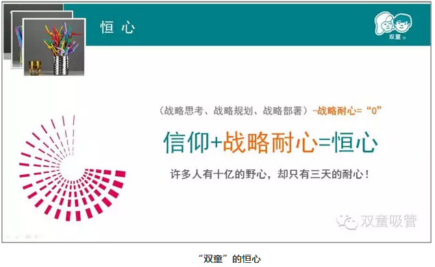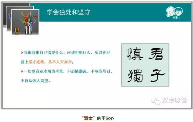 樓總談到自己時說:“一個人一輩子做好一件事就已經(jīng)很了不起了。”做企業(yè)有時候需要“一根筋”,理解“舍得”、懂得“放棄”,學會享受寂寞和孤獨!“雙童”始終堅持獨處和堅守,從不人云亦云,不被虛名所累,一切以商業(yè)本質(zhì)為考量。