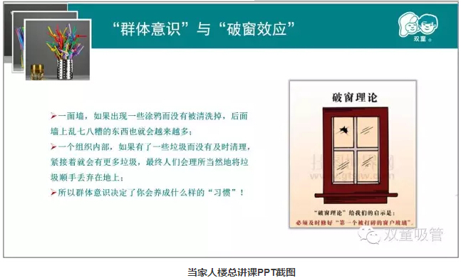 今年以來(lái),“雙童”一直在對(duì)公司的硬件按五星級(jí)的標(biāo)準(zhǔn)進(jìn)行再次的提升,不過(guò),我們可不是傳說(shuō)中的“人傻錢(qián)多”哦!在發(fā)展初期,我們以前的硬件完全可以滿足我們的管理需要,但現(xiàn)如今,“雙童”要實(shí)現(xiàn)90分向99分的突破和進(jìn)步,提升員工的質(zhì)量意識(shí),那就必須提升公司的硬件投入!在硬件提升的背后,就是為了規(guī)避“破窗效應(yīng)”!接下來(lái)吸管妞就向大家闡釋一下當(dāng)家人樓總在經(jīng)營(yíng)“雙童”的過(guò)程中是如何規(guī)避“破窗效應(yīng)”,形成好的“群體意識(shí)”,從而提升員工質(zhì)量意識(shí)和個(gè)人素質(zhì)!