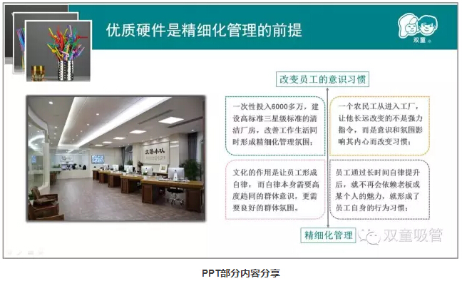 “雙童”在建廠之初就將所有的寢室按三星級(jí)的標(biāo)準(zhǔn)進(jìn)行裝修,今年我們的廚房餐廳、車間衛(wèi)生間也按五星級(jí)的標(biāo)準(zhǔn)裝修進(jìn)行再次提升。其實(shí),這就是在慢慢改變員工的意識(shí)形態(tài),在改善工作生活的同時(shí)形成精細(xì)化管理氛圍。員工通過(guò)長(zhǎng)時(shí)間自律提升后,就不再會(huì)依賴?yán)习寤蚰硞€(gè)人的魅力,就形成了員工自身的行為習(xí)慣。