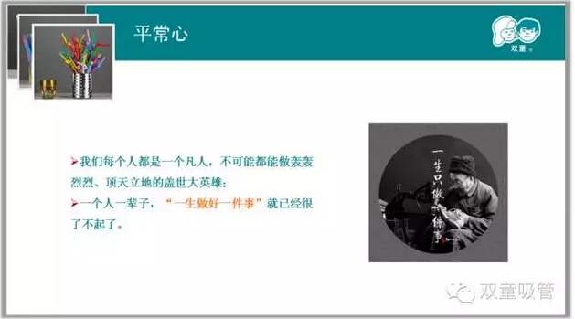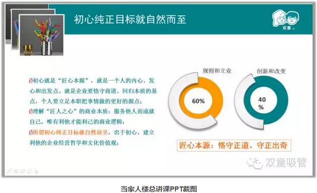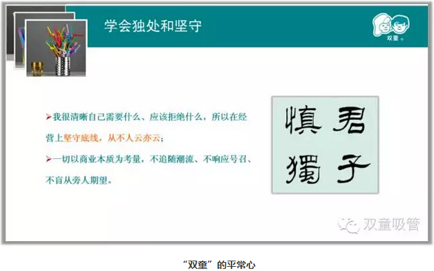 “恒心”是用長遠的眼光去看問題,我們強調戰(zhàn)略思考、戰(zhàn)略規(guī)劃、戰(zhàn)略部署,唯獨缺少戰(zhàn)略耐心。“雙童”堅持小客戶原則,堅持對員工投入,堅持走差異化的道路,“雙童”的發(fā)展也越來越好。創(chuàng)新就是改變,就是持續(xù)積累。創(chuàng)新需要戰(zhàn)略耐心,需要十年為一個單位的恒心。