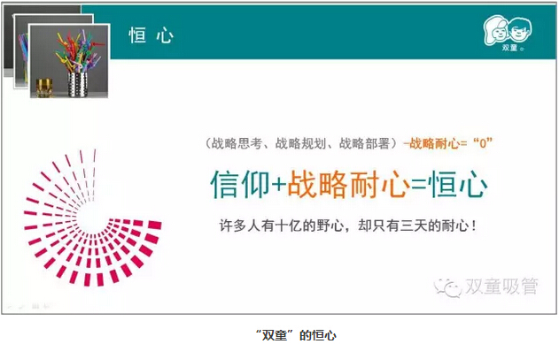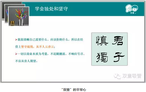 我們強(qiáng)調(diào)戰(zhàn)略思考、戰(zhàn)略規(guī)劃、戰(zhàn)略部署,唯獨(dú)缺少戰(zhàn)略耐心。“雙童”堅(jiān)持小客戶原則,堅(jiān)持對(duì)員工投入,堅(jiān)持走差異化的道路,“雙童”的發(fā)展也越來越好。創(chuàng)新就是改變,就是持續(xù)積累。創(chuàng)新需要戰(zhàn)略耐心,需要十年為一個(gè)單位的恒心。無論難易,要有耐心!這種耐心至少要堅(jiān)持五年、十年。二十多年的商業(yè)積累,造就了“雙童”的差異化和無可復(fù)制。