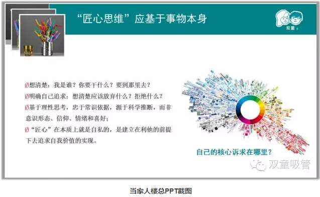 接下來,當(dāng)家人樓總和大家分享了“匠心思維”的三心——“初心”、“恒心”、“平常心”,向大家闡述了“雙童”通過匠人的做法背后的商業(yè)邏輯,以及他在經(jīng)營(yíng)企業(yè)過程當(dāng)中的所思所慮。
