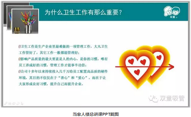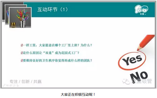 這不,一開場(chǎng)當(dāng)家人就讓妞發(fā)起了紅包福利,在看到“雙童”與一般企業(yè)的餐廳、寢室等硬件的對(duì)比之后,互動(dòng)真是停不下來(lái)啦!一樣工資的情況下,大家愿意在哪個(gè)工廠上班?要維持良好的衛(wèi)生秩序你覺得要形成什么樣的團(tuán)隊(duì)?