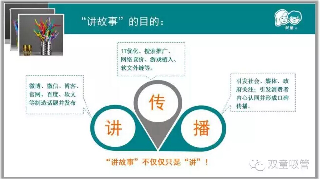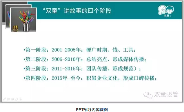 課程開始,吸管妞也從“雙童”是如何做自媒體傳播的故事開始講起。沒想到,原來“雙童”的文化傳播還分為好幾個階段,從硬廣時期,到后來的塑造差異化亮點,引導(dǎo)媒體給“雙童”講故事,再到成立文宣部門,形成團(tuán)隊“講故事”,最后達(dá)到形成企業(yè)文化,形成口碑傳播。“雙童”之所以有今天的文化影響力,與當(dāng)家人樓總的遠(yuǎn)見卓識是密不可分的!