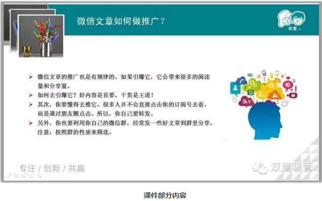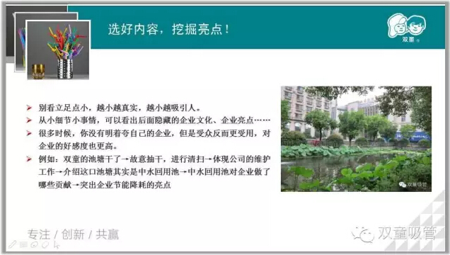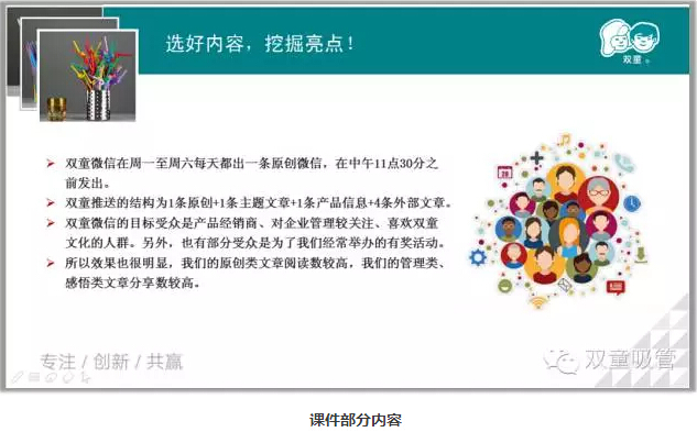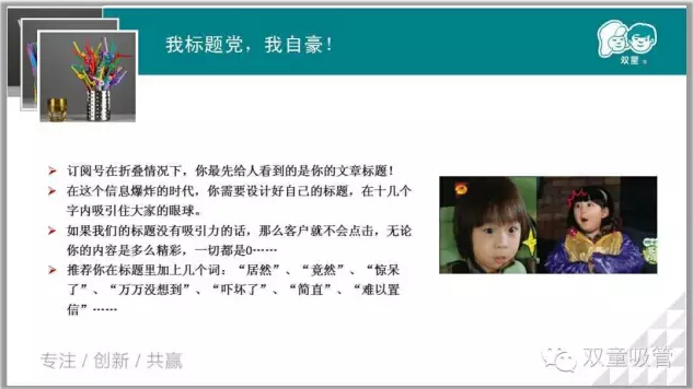 微信也是講故事的一種傳播方式,用微信公眾平臺作為營銷和品牌推廣工具已是眾大企業(yè)和商家的不二之選。那么,究竟如何才能事半功倍地運營微信公眾平臺呢?不吹牛的說,吸管妞經(jīng)常能聽到一些朋友對“雙童吸管”微信公眾平臺的夸贊,說這是義烏企業(yè)界運營得最好的微信公眾號。接下來妞和大家分享在運營“雙童吸管”微信公眾號時所積累的一些經(jīng)驗,把它們做成PPT分享給大家,共同分享,共同進(jìn)步!