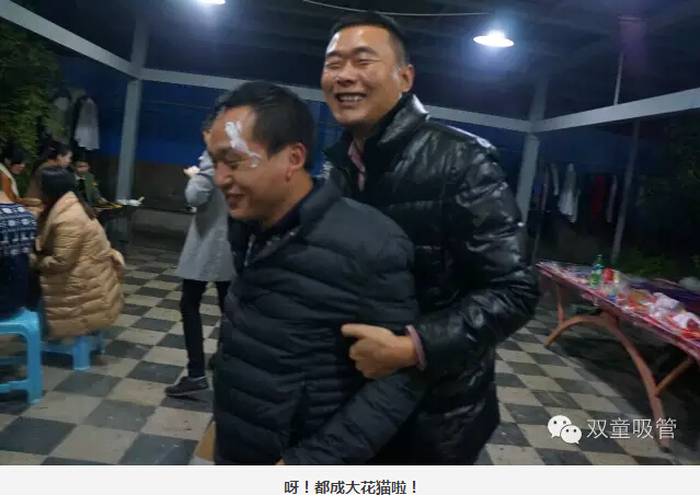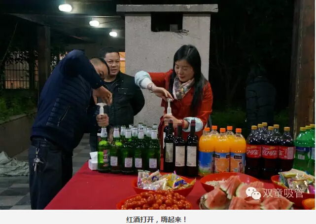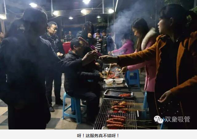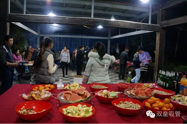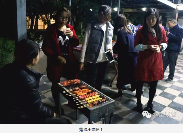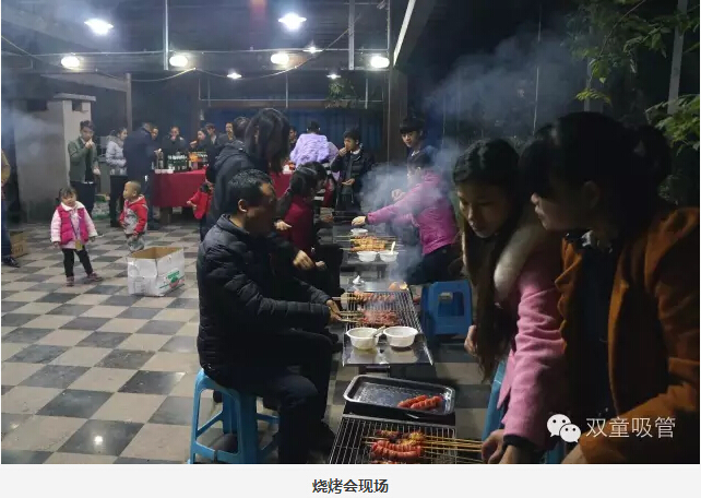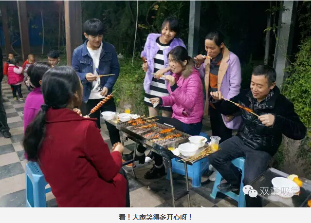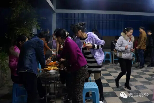 大家圍坐在烤爐前,領導們爭當“燒烤小販”,為壽星們進行服務。圍著一桌好吃的則是“雙童”的一線員工,喝著美酒吃著主管們烤的肉串,瞧大家笑得多開心!往往員工手上的還沒吃完,這邊領導們就已經(jīng)笑瞇瞇地把新烤好的肉串奉上了,吃都來不及,這是什么節(jié)奏!