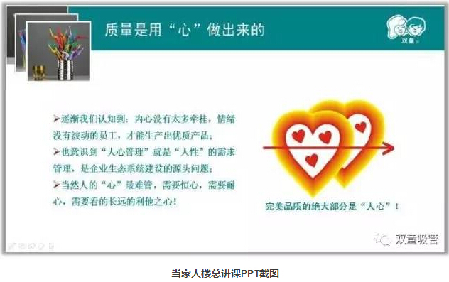 “雙童”逐漸認知到:“家”是員工最大的牽掛,只有改變員工才能改變產(chǎn)品從而改變企業(yè)。“人心”最難管,員工沒有了牽掛,才能全身心投入到工作當中,才能做出更加完美精細的產(chǎn)品,人心管理就是企業(yè)生態(tài)系統(tǒng)的改善。從2005年9月開始,“雙童”明確把“家文化”作為員工管理的著力點,以“小家”形成“大家”,凝聚團隊“人心”!