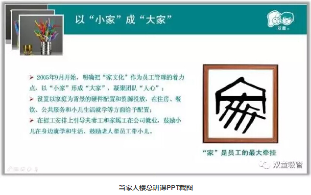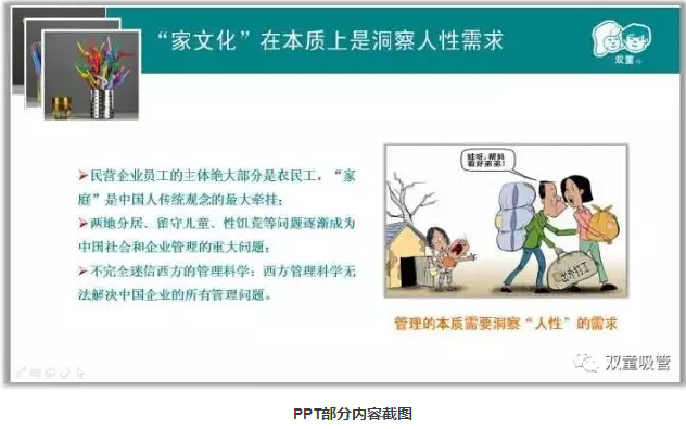 從管理的本質上來說,管理理念也應該與當?shù)氐膫鹘y(tǒng)文化相結合,由于“家庭”是中國人傳統(tǒng)觀念的最大牽掛,所以在管理上不能一味學習西方管理科學。這幾年由于外出務工的農(nóng)民工越來越多,兩地分居、留守兒童、性饑荒等問題逐漸成為中國社會和企業(yè)管理的重大問題。但因為形成了“家文化”氛圍,這些問題在“雙童”都得到了根本性解決,也讓企業(yè)避免了許多復雜性問題,更加和諧!