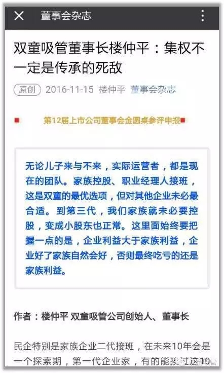 中國(guó)的傳統(tǒng)企業(yè)發(fā)展到如今,有一個(gè)問(wèn)題已經(jīng)越來(lái)越凸顯出來(lái),也就是企業(yè)主們常說(shuō)的二代傳承問(wèn)題。“雙童”也不例外,當(dāng)家人樓總早在五年前就想到了這個(gè)問(wèn)題,并發(fā)表了第二個(gè)五年發(fā)展規(guī)劃,其中提到了三個(gè)關(guān)鍵詞“持續(xù)創(chuàng)新,再造經(jīng)理人,解決二代傳承”。下面是當(dāng)家人樓總對(duì)于家族企業(yè)二代接班寫的一篇文章刊登在了《董事會(huì)》雜志上,引起了很多企業(yè)主的共鳴!下面妞就帶大家來(lái)看看吧!
