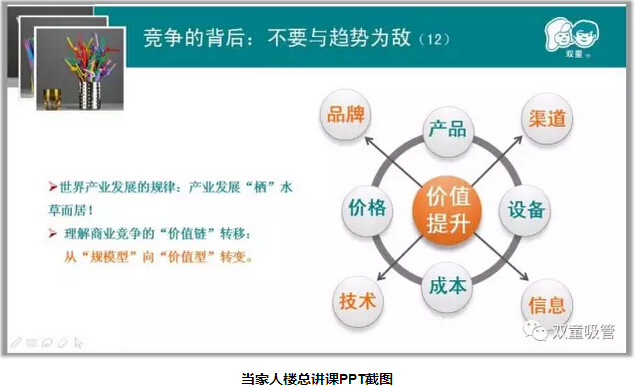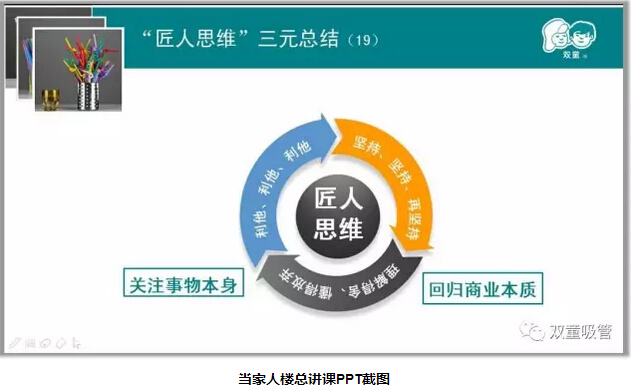 當家人樓總圍繞“匠人思維”的商業(yè)本質(zhì)、“競爭”的商業(yè)本質(zhì)兩方面進行分享!首先當家人樓總講述了他對“匠人思維”的理解,從本質(zhì)上來講“匠人”不只是為他人著想,更不是大公無私,而是基于理性、立足客觀、看的長遠。只有遵循商業(yè)本質(zhì),凡事長遠計議,以利他之心去經(jīng)營才能把事業(yè)做好。同時,當家人樓總也和大家分享了“雙童”的發(fā)展也一直圍繞著“匠人之心”——“初心”、“恒心”、“平常心”。