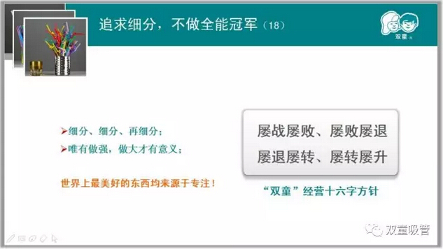 其實真正把自己的產(chǎn)品做好了,企業(yè)在一定時候擴大規(guī)模才是自然而至!“雙童”的發(fā)展始終伴隨著不斷地放棄,在自己的領(lǐng)域里細分細分再細分,把一根吸管做到極致!在利他的基礎(chǔ)上不斷堅持,懂得放棄,關(guān)注事物本身,回歸商業(yè)本質(zhì)!