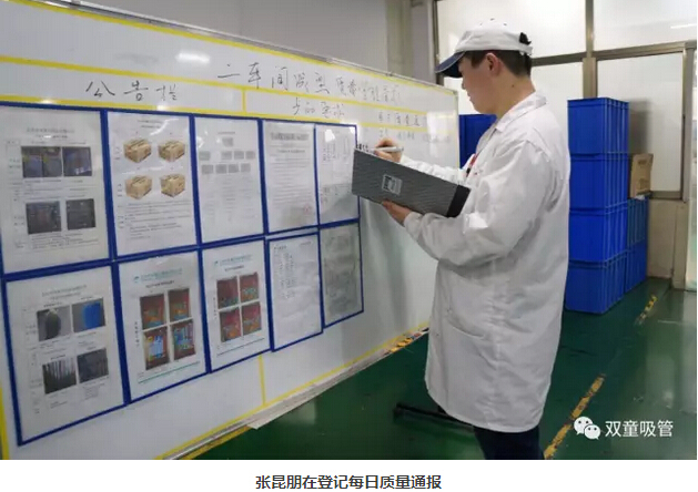 每天,張昆朋都要對產(chǎn)品進(jìn)行檢驗。從核對訂單開始做起,檢查生產(chǎn)的產(chǎn)品是否符合訂單要求,同時對生產(chǎn)過程中的產(chǎn)品進(jìn)行檢驗,檢查管子是否有裂口,管子的長度、圓度、顏色等是否符合標(biāo)準(zhǔn),禁止不合格品流出車間!除此之外,產(chǎn)品有沒有出現(xiàn)多支或少支的情況,產(chǎn)品的包裝袋是否有臟物以及紙箱是否符合訂單要求都要進(jìn)行抽檢。抽檢結(jié)束后所檢產(chǎn)品要進(jìn)行數(shù)據(jù)記錄,并在車間質(zhì)量管理看板上登記每日質(zhì)量通報,警醒員工們不要犯同樣的錯誤!他說:“我要確保從我手上出去的吸管是世界上最好的吸管!”