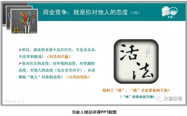 接下來,樓總分享了“匠人思維”的商業(yè)本質(zhì),商業(yè)在本質(zhì)上就像“生物依賴于環(huán)境”,直接或間接地依賴客觀上存在的社會、組織和個(gè)體當(dāng)中,并形成相互依存、彼此共存的經(jīng)濟(jì)共同體。所以,商業(yè)的本質(zhì)不是打打打,不是殺殺殺,不是零和游戲!