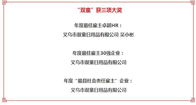 1月10日下午,“我的企業(yè)我的家”2016義烏最佳企業(yè)文化暨“最佳雇主”評選頒獎典禮在義烏工商學(xué)院舉行,近百位企業(yè)負(fù)責(zé)人共同見證了義烏新一屆“最佳雇主”的誕生!“雙童”也名列其中,被評為2016中國義烏年度"最佳雇主"及“最具社會責(zé)任雇主”企業(yè),副總吳小彬也被評為年度最佳雇主卓越HR!其實“雙童”一直以來都十分重視員工關(guān)懷,下面妞就帶大家來看看“雙童”是如何做的吧!