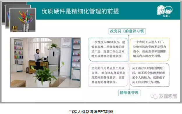 優(yōu)質(zhì)硬件是精細(xì)化管理的前提,更是提升產(chǎn)品品質(zhì)的前提,它不僅能潛移默化地影響員工的素養(yǎng),更能提高員工的質(zhì)量意識(shí)!所以好的環(huán)境決定了員工會(huì)做出怎樣的產(chǎn)品!唯有一流的硬件環(huán)境,才能生產(chǎn)出世界一流的完美產(chǎn)品!看到這里,大家應(yīng)該明白“雙童”為何能做好一根小吸管了吧!