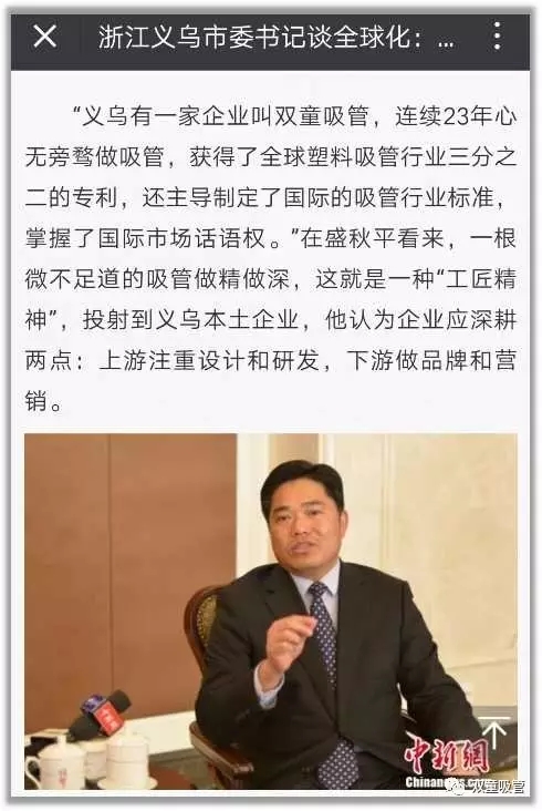 春節(jié)期間,義烏市委書記盛秋平在2017義烏幸福湖論壇上接受了中國(guó)新聞網(wǎng)記者的采訪,在提到“浙江制造”的話題時(shí)點(diǎn)名提到了“雙童”,盛贊“雙童”的工匠精神!其實(shí)“雙童”的工匠精神也引起了各大媒體的關(guān)注報(bào)道,接下來吸管妞就帶大家重溫人民網(wǎng)關(guān)注“雙童”工匠精神的新聞,快來看看吧!
