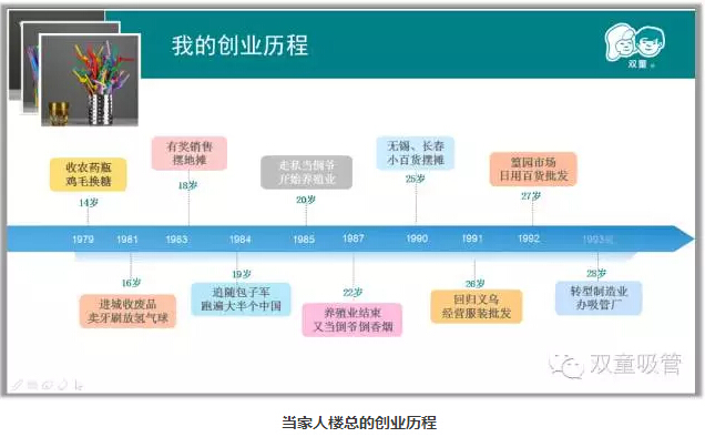 樓仲平開始思考不能只做代銷,要有自己的工廠。他就在村里租了兩間民房辦起了吸管,1995年,樓仲平還給自己的產(chǎn)品注冊(cè)了“雙童”商標(biāo)。1997年,樓仲平結(jié)識(shí)了一位日本客戶,讓他做生意的理念發(fā)生轉(zhuǎn)變。他決定改變粗放經(jīng)營(yíng)的薄利多銷,在企業(yè)管理中追求精益求精。樓仲平說,這個(gè)理念應(yīng)該就是現(xiàn)在說的“工匠精神”。