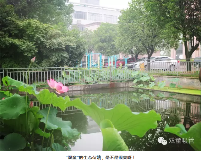 在大草坪旁是“雙童”人最喜歡駐足停留的生態(tài)荷塘。它不僅美化環(huán)境,而且還是我們的中水儲存池,起到了節(jié)能降耗的作用!
