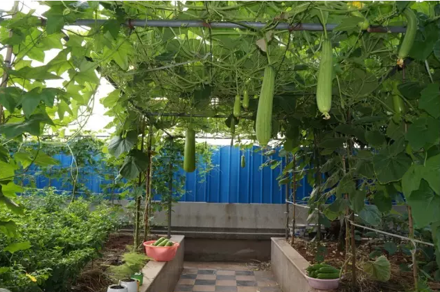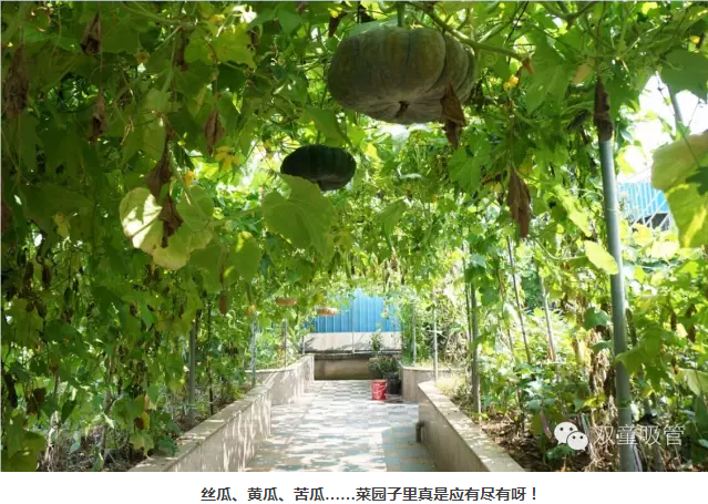“雙童”的屋頂菜園有700多平方米,種著二三十種蔬菜!南瓜、絲瓜、苦瓜、冬瓜、辣椒…… 菜園子里的蔬菜真是應有盡有,自家種的菜,在眼皮子底下發(fā)芽成長,開花結果,安全放心!