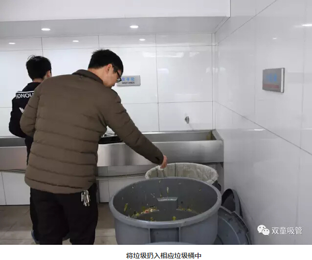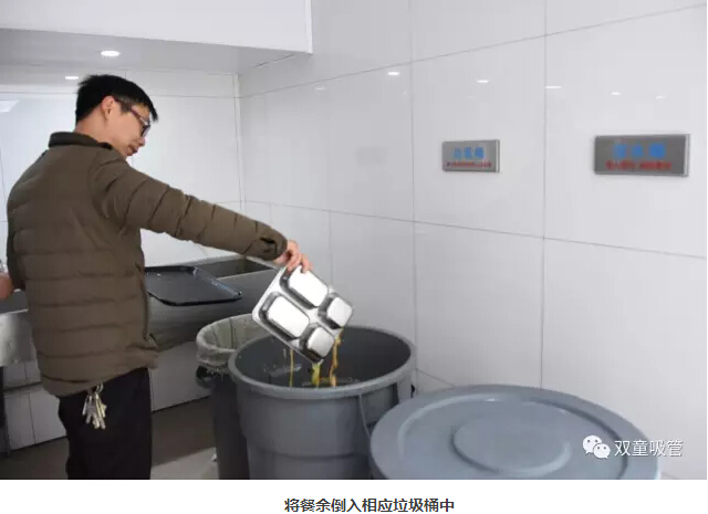 3、將餐余和垃圾倒入相應(yīng)的桶內(nèi)。