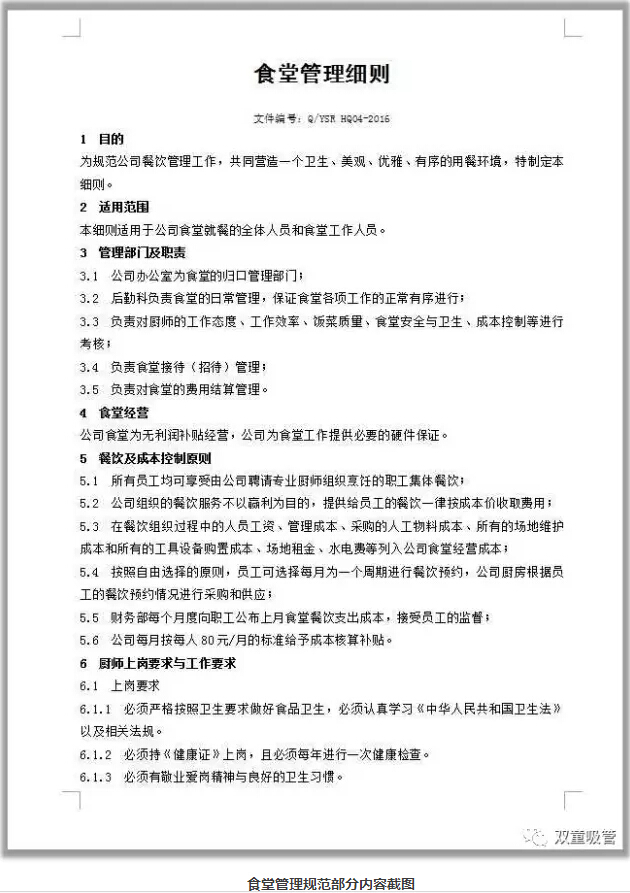 對(duì)于餐飲的管理,我們也有一系列的制度文件支撐!從1997年開(kāi)始,“雙童”就對(duì)食堂進(jìn)行了規(guī)范管理,制定了很多的管理型文件!