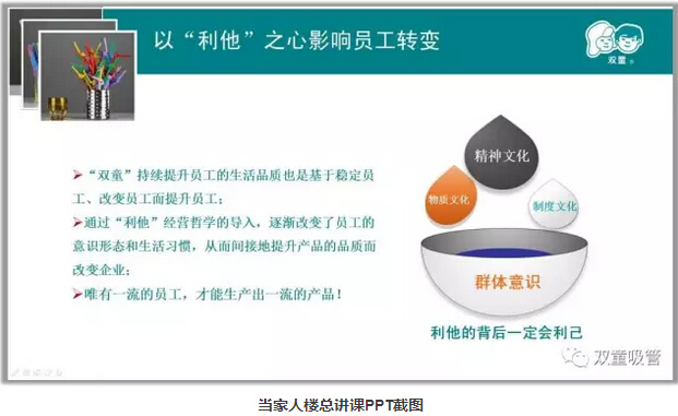 同時(shí)“雙童”持續(xù)提升員工生活品質(zhì)其目的不僅僅在于“善心”和“愛(ài)心”,也是基于穩(wěn)定員工、改變員工而提升員工!影響產(chǎn)品質(zhì)量的最大要素是人的內(nèi)心,通過(guò)“利他”的方式,逐漸改變員工的意識(shí)形態(tài)和生活習(xí)慣,從而間接地提升產(chǎn)品的品質(zhì)而改變企業(yè)。員工的習(xí)慣好了,思想轉(zhuǎn)變了,才能用“心”生產(chǎn)出一流的產(chǎn)品!