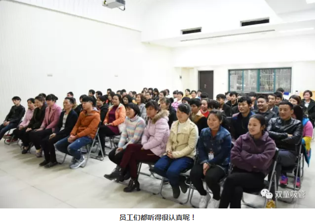 這不,二當(dāng)家李二橋和副總吳小彬在對新員工們表示了歡迎后,介紹了“雙童”的企業(yè)文化和基本情況。從“雙童”的廠房變遷、發(fā)展歷程等方面詳細地介紹了“雙童”。這可滿足了新員工們的好奇心,感受到“雙童”這個大家庭的溫暖,大家工作起來都動力十足了呢!