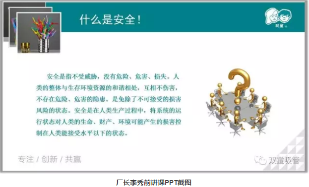 說完了企業(yè)文化,安全工作也是必不可少!廠長通過員工的安全生產(chǎn)職責(zé)、生活安全注意事項、消防安全等方面詳細地講解了安全知識的重要性,并通過一些令人警醒的案例提醒員工們工作生活中一定要注意安全。