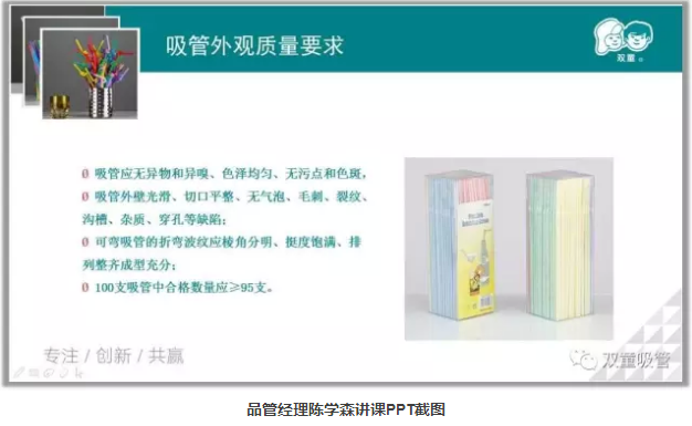 廠長李秀前再次登臺和大家分享了《衛(wèi)生秩序保障作業(yè)規(guī)范》,介紹了在進入車間前洗手消毒等一系列的操作步驟,以及進入車間后在工作崗位上的注意事項。品管部經(jīng)理則給新同事講起了產(chǎn)品質(zhì)量的相關(guān)內(nèi)容,從吸管的材質(zhì)、分類開始講起一直到吸管的各項質(zhì)量要求、衛(wèi)生要求,引導(dǎo)員工們提升質(zhì)量意識!