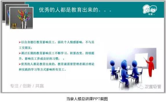 看,當(dāng)家人樓總的身邊,就坐著二當(dāng)家李二橋和行政副總吳小彬,無(wú)論有什么事,隨時(shí)都可以展開(kāi)溝通和討論,通過(guò)言傳身教來(lái)影響核心管理層,不僅大大降低了溝通成本,而且也促進(jìn)了雙方的互相了解,提升了辦事效率。