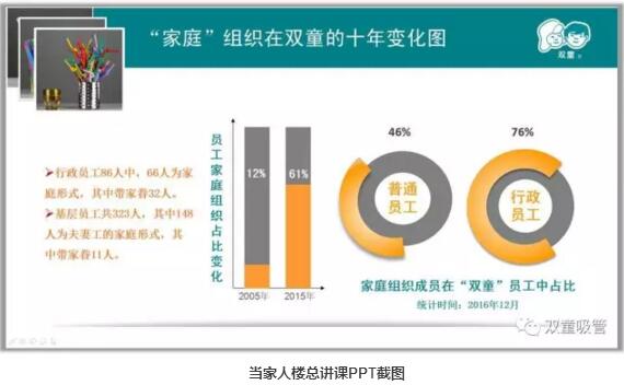 在“雙童”,我們鼓勵(lì)員工在公司內(nèi)部談戀愛(ài)、結(jié)婚成家、養(yǎng)育小兒、就學(xué)安居,公司提供盡力幫助。通過(guò)這樣的引導(dǎo),高達(dá)61%的員工都以家庭組織形式存在。當(dāng)家人樓總說(shuō),唯有幫員工解決了家庭問(wèn)題,員工才不會(huì)有后顧之憂(yōu),才會(huì)卯足勁地為公司奮斗!