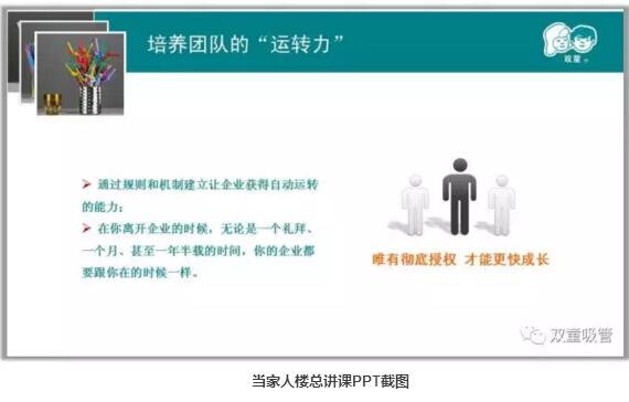 在“雙童”,還有一個(gè)讓當(dāng)家人樓總倍感驕傲的有趣現(xiàn)象。通過(guò)長(zhǎng)期的規(guī)則和機(jī)制建立,“雙童”已經(jīng)有了自動(dòng)運(yùn)轉(zhuǎn)的能力。如果當(dāng)家人樓總不在公司,不會(huì)有任何員工打他的電話(huà)詢(xún)問(wèn)工作應(yīng)該如何決策。哪怕樓總外出旅游兩三個(gè)月,公司也照常運(yùn)轉(zhuǎn),不受任何影響。當(dāng)家人樓總也對(duì)管理層放話(huà):唯有對(duì)你們徹底授權(quán),你們才會(huì)成長(zhǎng)得更快!