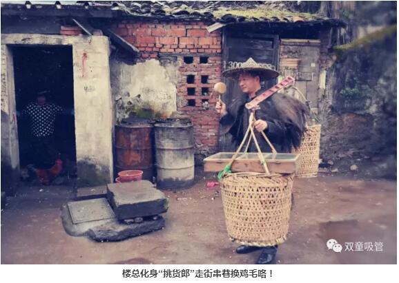 原來,這是應(yīng)中國義烏網(wǎng)的記者要求,當(dāng)家人樓總在給最近大火的電視劇《雞毛飛上天》拍攝宣傳海報呢!我們特地驅(qū)車到義烏“雞毛換糖”的發(fā)源地廿三里,當(dāng)家人樓總重拾三十多年前的舊業(yè),走街串巷換雞毛嘍!