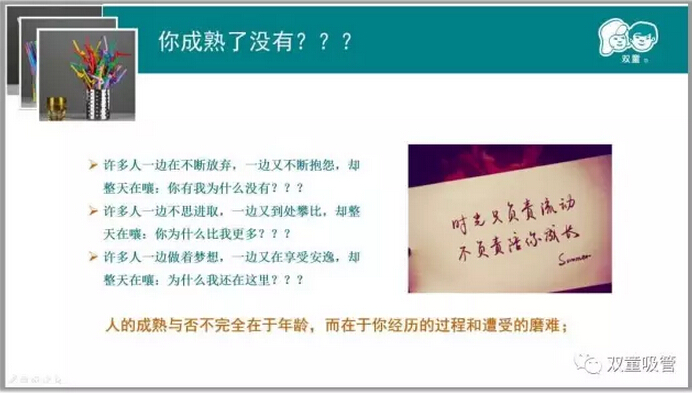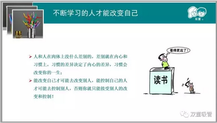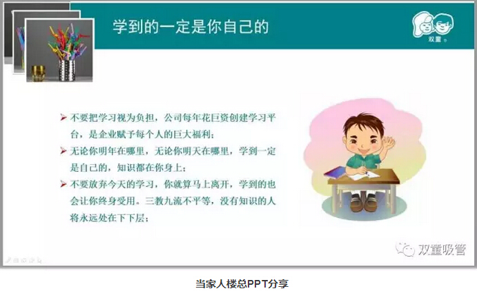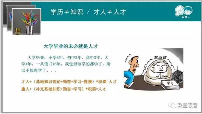 學(xué)歷≠知識、才人≠人才,樓總也鼓勵(lì)大家,一定要堅(jiān)持學(xué)習(xí),學(xué)習(xí)并不是學(xué)校里才需要做的事!如果工作以后就不思進(jìn)取,不學(xué)習(xí)提升,就算是博士生,“雙童”也不會對你敞開大門!而對于那些肯學(xué)習(xí)、肯鉆研的員工,“雙童”會提供非常多的學(xué)習(xí)機(jī)會和提升空間,讓你在“雙童”有一個(gè)更好的發(fā)展!就算有一天你離開了“雙童”,你學(xué)到的始終是你自己的!