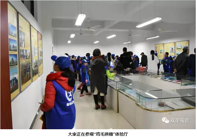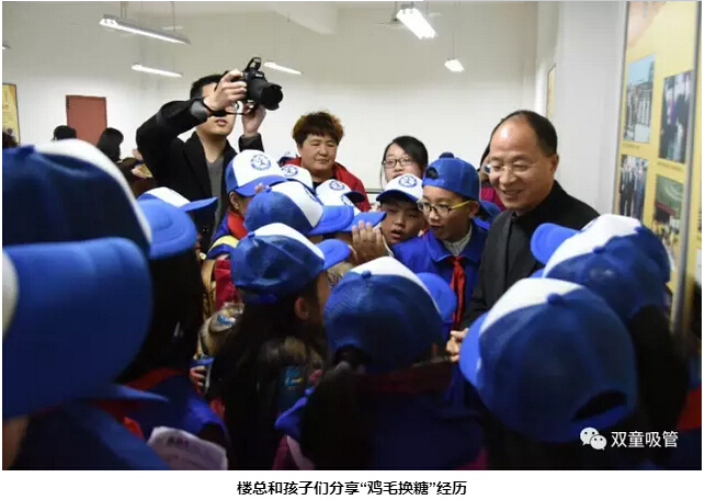 首先,大家一起來到了“雞毛換糖”體驗(yàn)廳,參觀了“雞毛換糖”的歷史展示。新華小記者們圍著當(dāng)家人樓總爭先恐后的提出“雞毛換糖”問題,樓總也和孩子們講述了自己當(dāng)年“雞毛換糖”的故事。